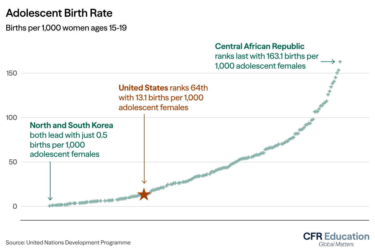 The causes of high adolescent birth rates vary. For example, in Zimbabwe, the effects of climate change drive families deeper into poverty, increasing rates of child marriage and, therefore, early pregnancy. Read more about this issue in this article from Think Global Health.