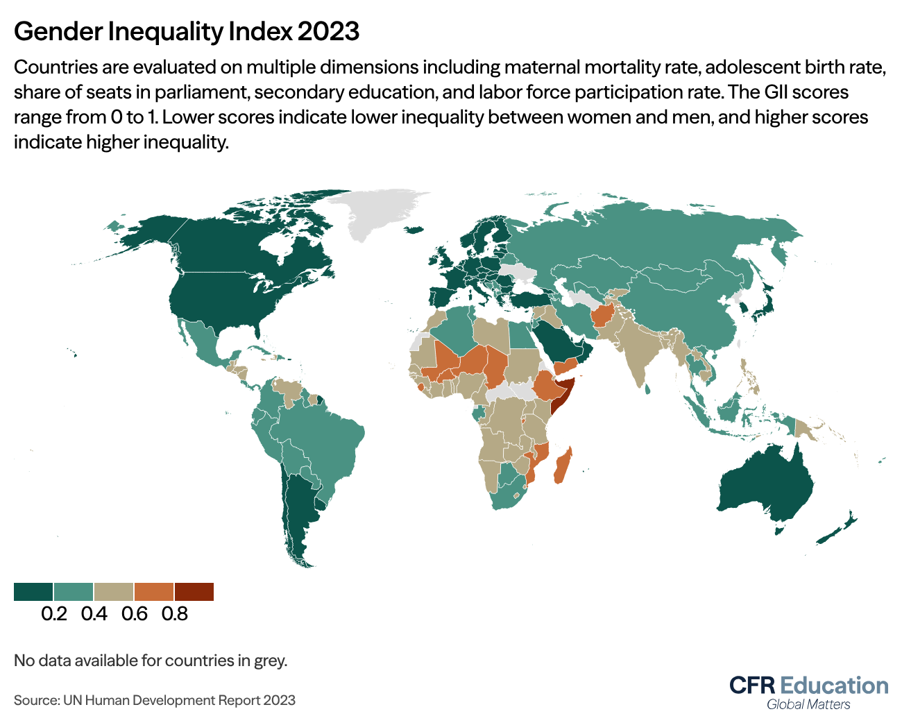 There is a lot to explore in this new resource, but let’s look at one of the data sets. The UN Human Development Report publishes the Gender Inequality Index (GII) annually to assess inequality between women and men worldwide. This map shows each country’s score on a scale from 0 to 1. More equal countries have lower scores, and less equal countries have higher scores.